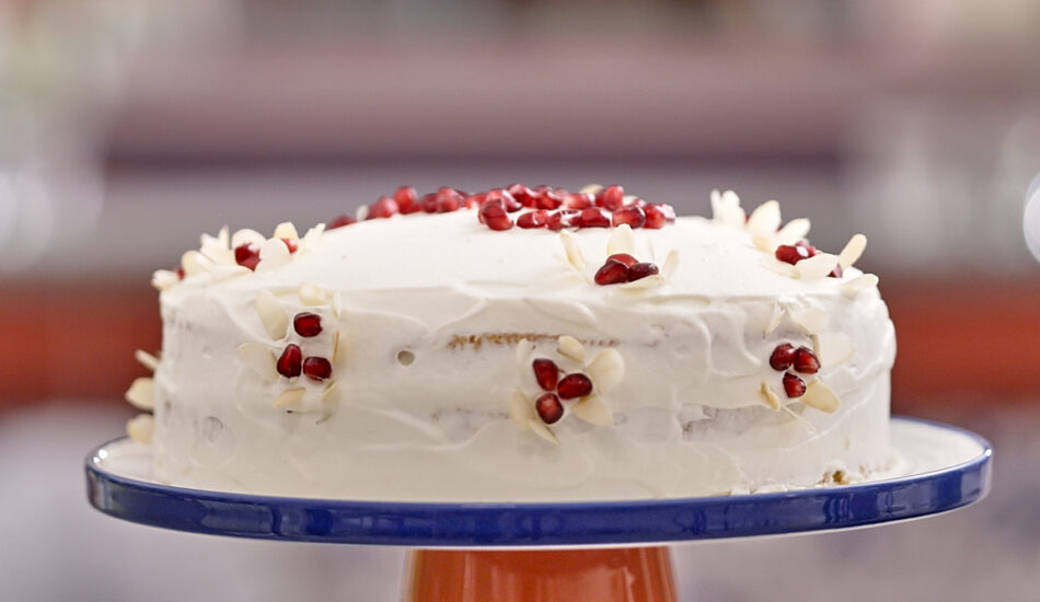 - Maak vervolgens bloempjes van granaatappelpitjes en amandelschaafsel.