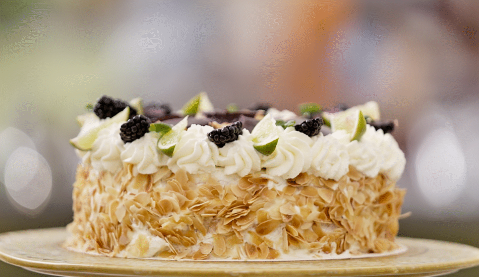 Deze slagroomtaart heeft de perfecte verhouding tussen zoet en fris. Of zoals Jannie zegt: “Ik ben verrast door de zuur van de limoen en de basilicum, die versterken elkaar.” Ook heeft het een hele zachte basis, want volgens Robèrt is de biscuit lekker zacht, “het eet echt als een slagroomtaart”.