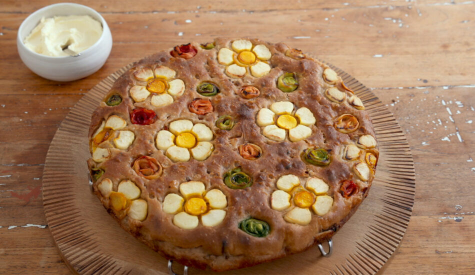 - Plaats de focaccia op een serveerplank en serveer met de roomkaas botercrème.